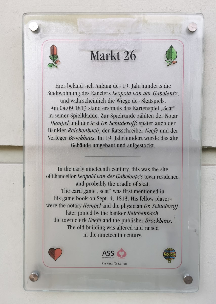 Ebenfalls aus dem 19. Jahrhundert stammt der Deutsche Skatverband. Er wurde im Jahr 1899 in Halle an der Saale gegründet. Nach der deutschen Teilung wechselte er jedoch zwischen 1954 und 2001 nach Bielefeld. Erst elf Jahr nach der Deutsch Deutschen Wiedervereinigung ging der Sitz des DSkV wieder zurück in die neuen Bundesländer nach Altenburg. Heute findest du seinen Sitz direkt am schönen Marktplatz. Zusammen mit der International Skat Players Association (ISPA) kümmert sich der Deutsche Skatverband um die Regeln des Kartenspiel und richtet zudem auch die Deutschen Meisterschaften aus.