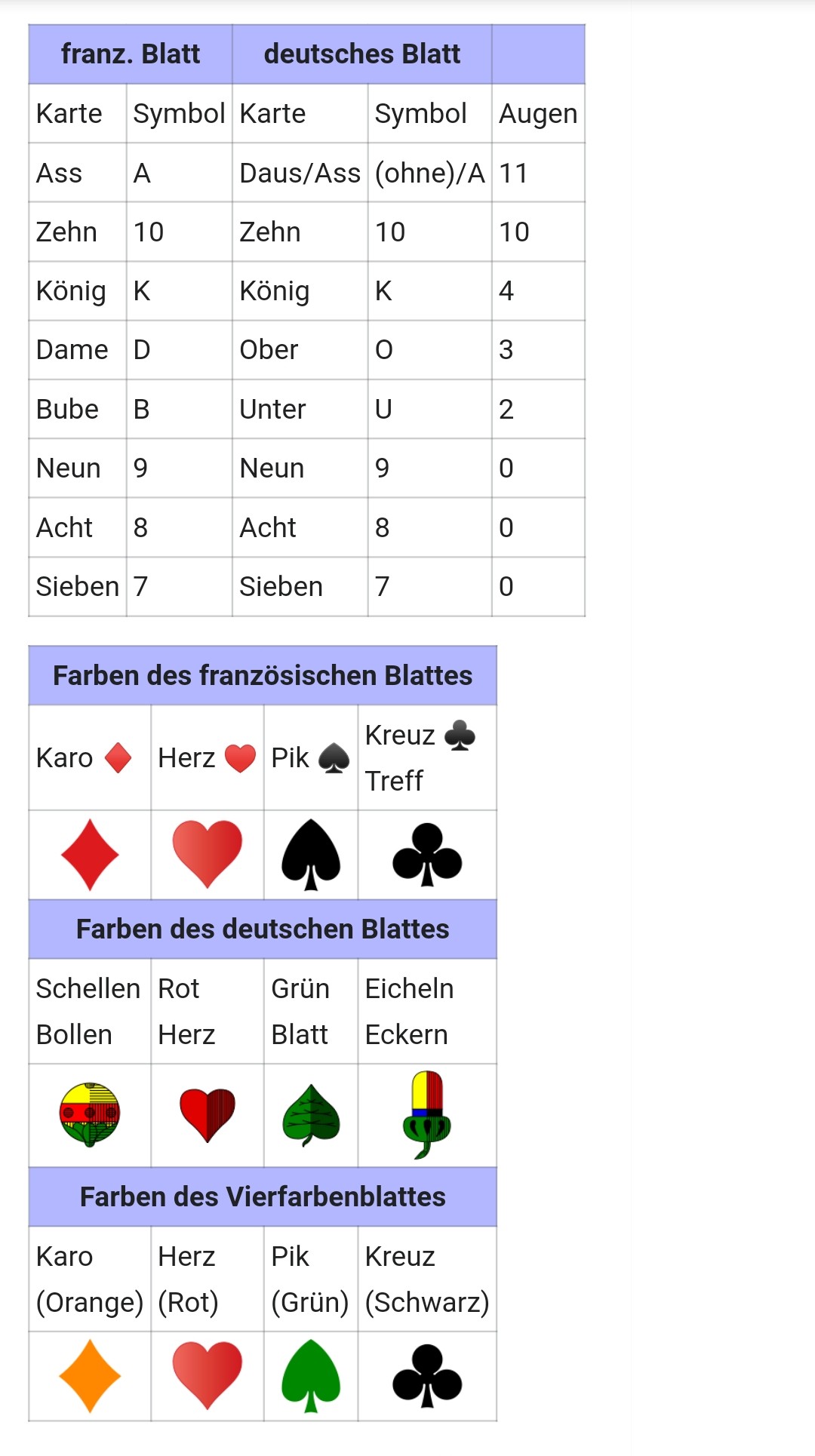 Gespielt wird entweder mit dem deutschen Blatt (Ost-, Mittel- und Süddeutschland) oder dem französischen Blatt, das in West- und Norddeutschland gebräuchlich ist. Die Spielkarten setzen sich zusammen aus den Farben Kreuz (Eichel), Pik (Grün), Herz (Herz) und Karo (Schell). Jede Farbe hat acht Spielkarten mit einem Ass, König, Dame (Ober), Bube (Unter) sowie einer 10, 9, 8 und einer 7. In Klammern für das Deutsche Blatt.